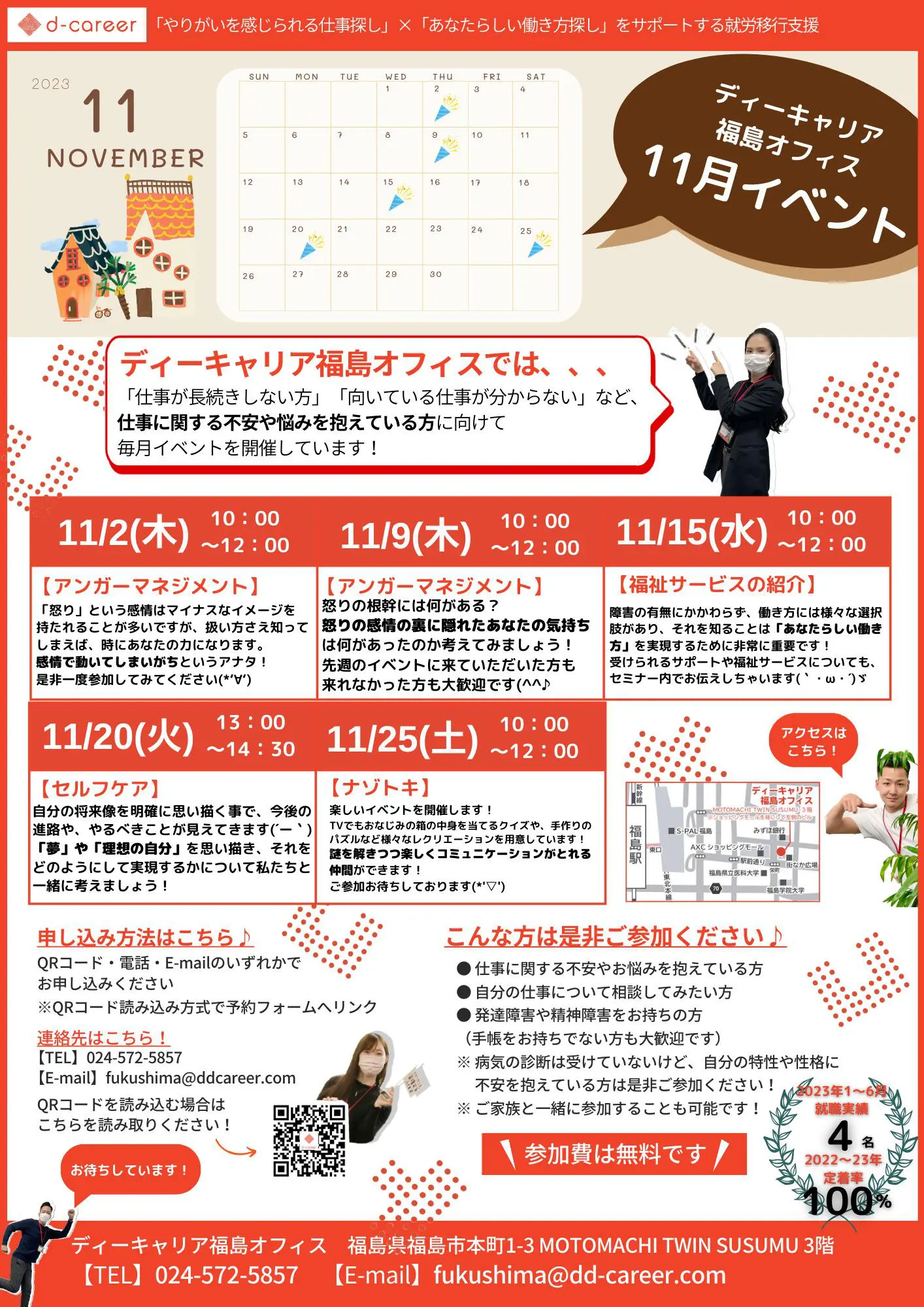 【ディーキャリア福島オフィス】11月20日(月)「自己管理・自己対処の方法(セルフケア)について知ろう❣」