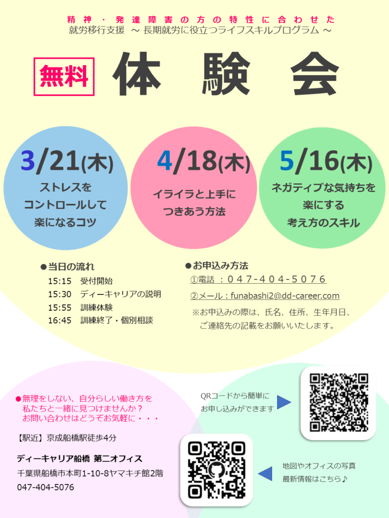 【ディーキャリア船橋第二オフィス】3月21日(木)「体験会「ストレスをコントロールして楽になるコツ」」