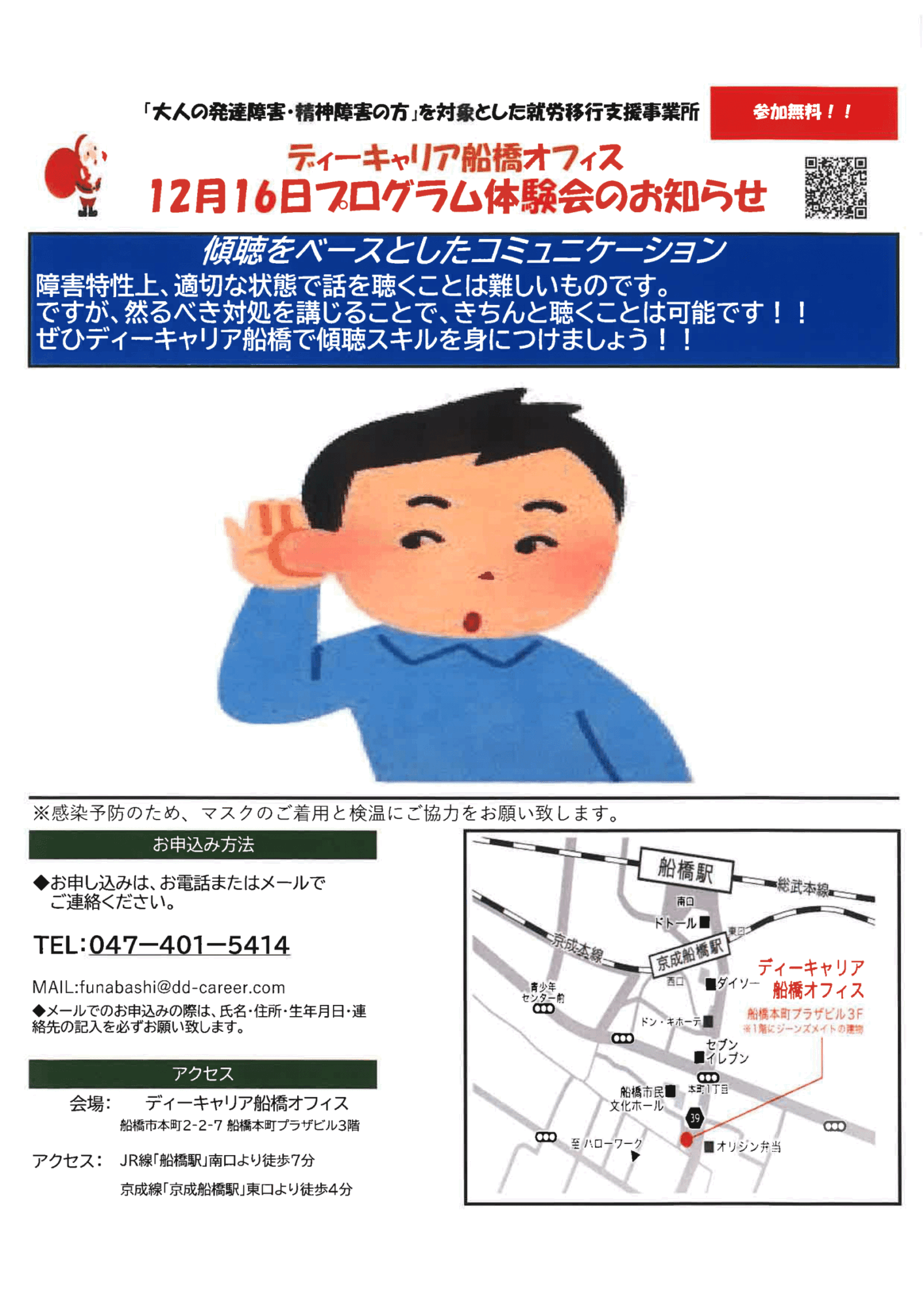 【ディーキャリア船橋オフィス】12月16日(金)「聞き上手になろう!!傾聴をベースとしたコミュニケーション」