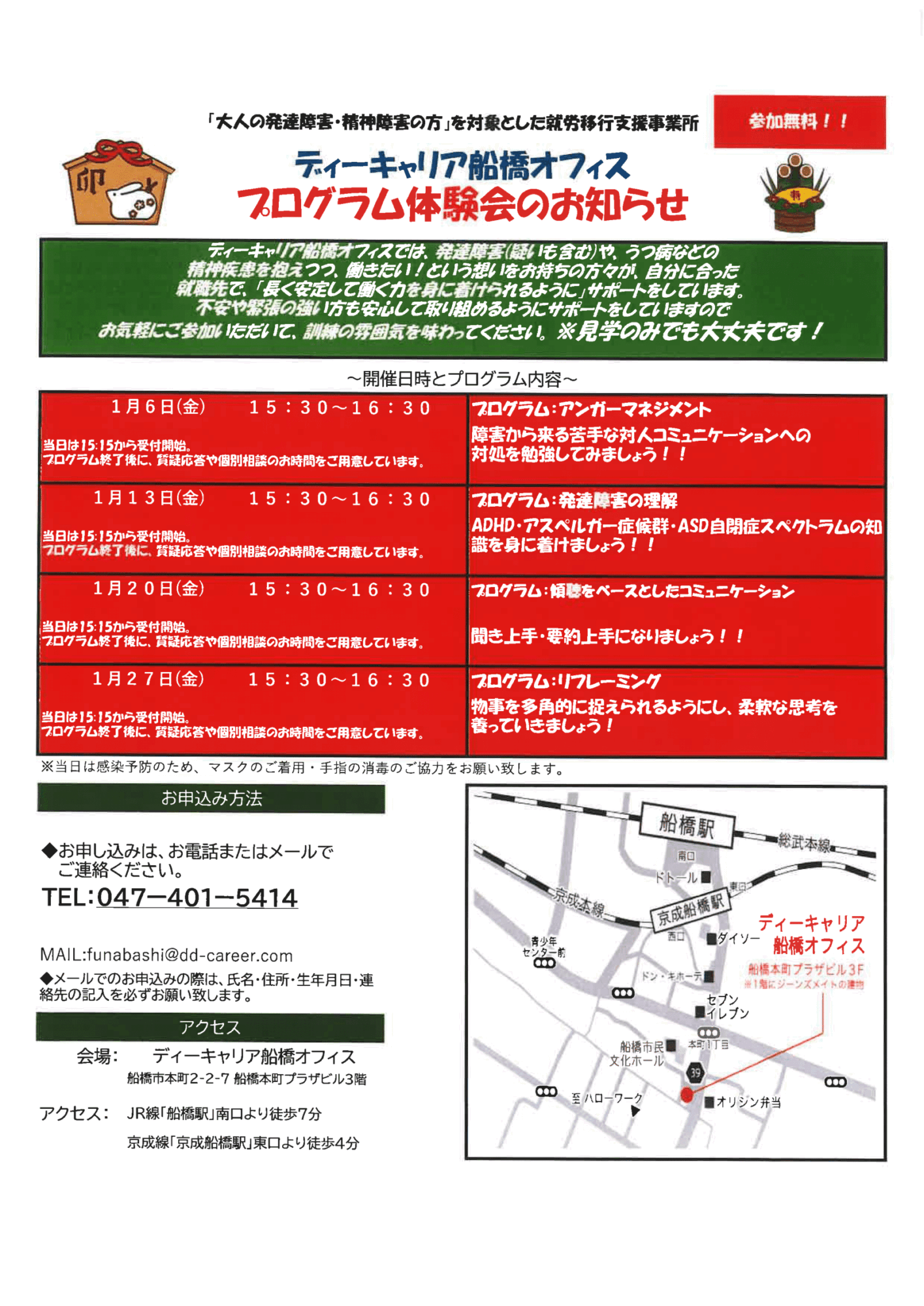 【ディーキャリア船橋オフィス】2023年1月毎週金曜日開催「1月度プログラム体験会のお知らせ」
