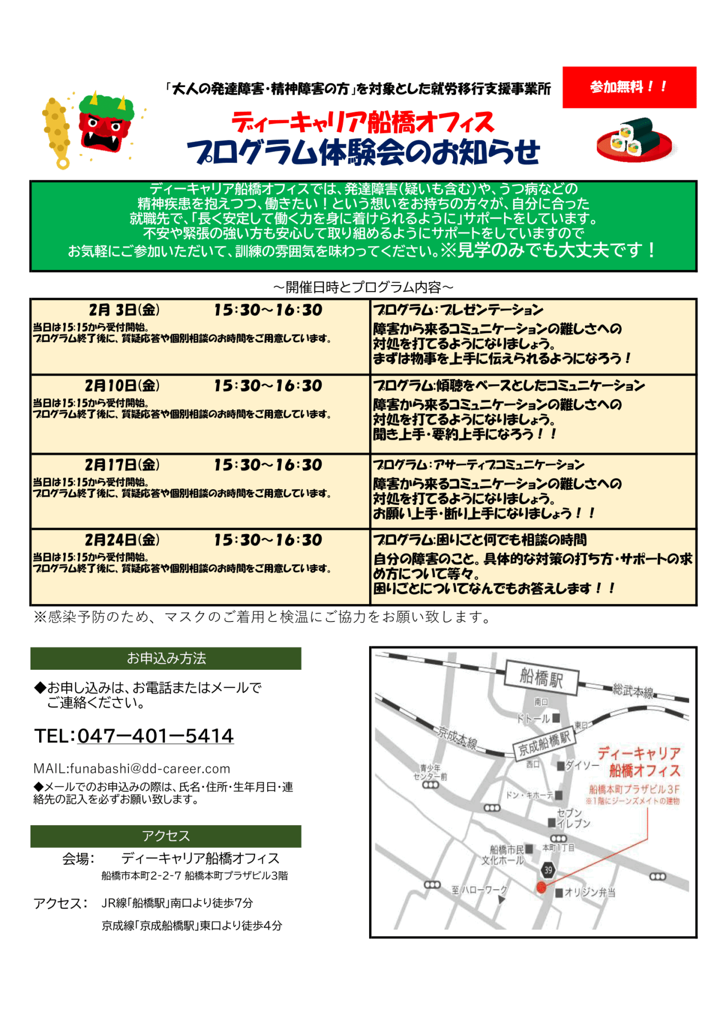 【ディーキャリア船橋オフィス】2月毎週金曜日開催「2月度プログラム体験会のお知らせ」