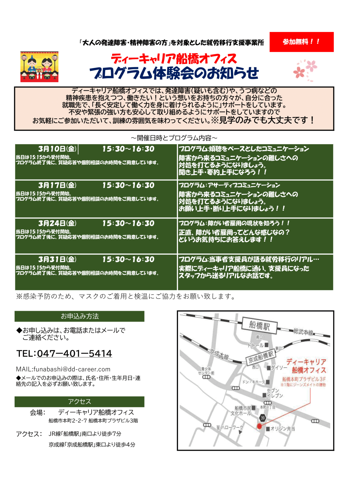 【ディーキャリア船橋オフィス】3月毎週金曜日開催「3月度プログラム体験会のお知らせ」