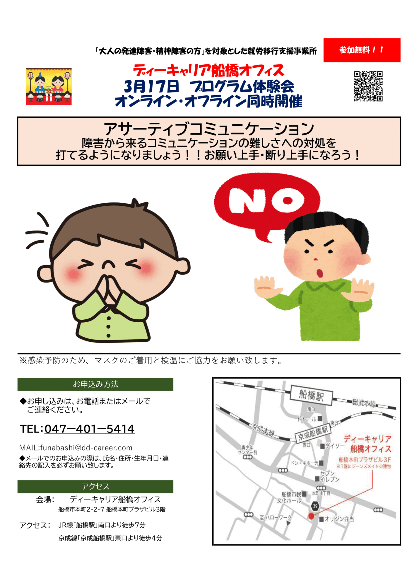 【ディーキャリア船橋オフィス】3月17日(金)「お願い上手・断り上手になろう!アサーティブコミュニケーション」