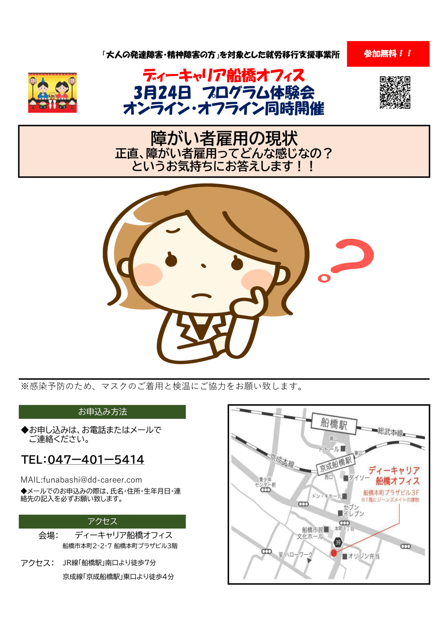 【ディーキャリア船橋オフィス】3月24日(金)「障がい者雇用の現状」