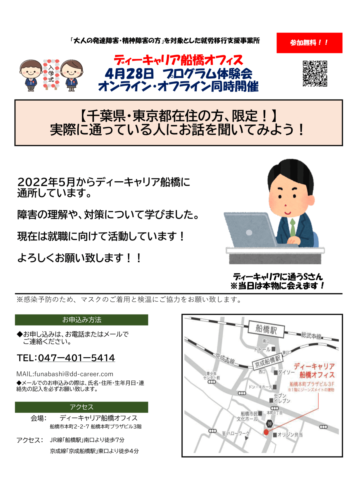 【ディーキャリア船橋オフィス】4月28日(金)「【千葉県・東京都在住の方限定】実際に通っている方のお話を聞いてみよう!!」