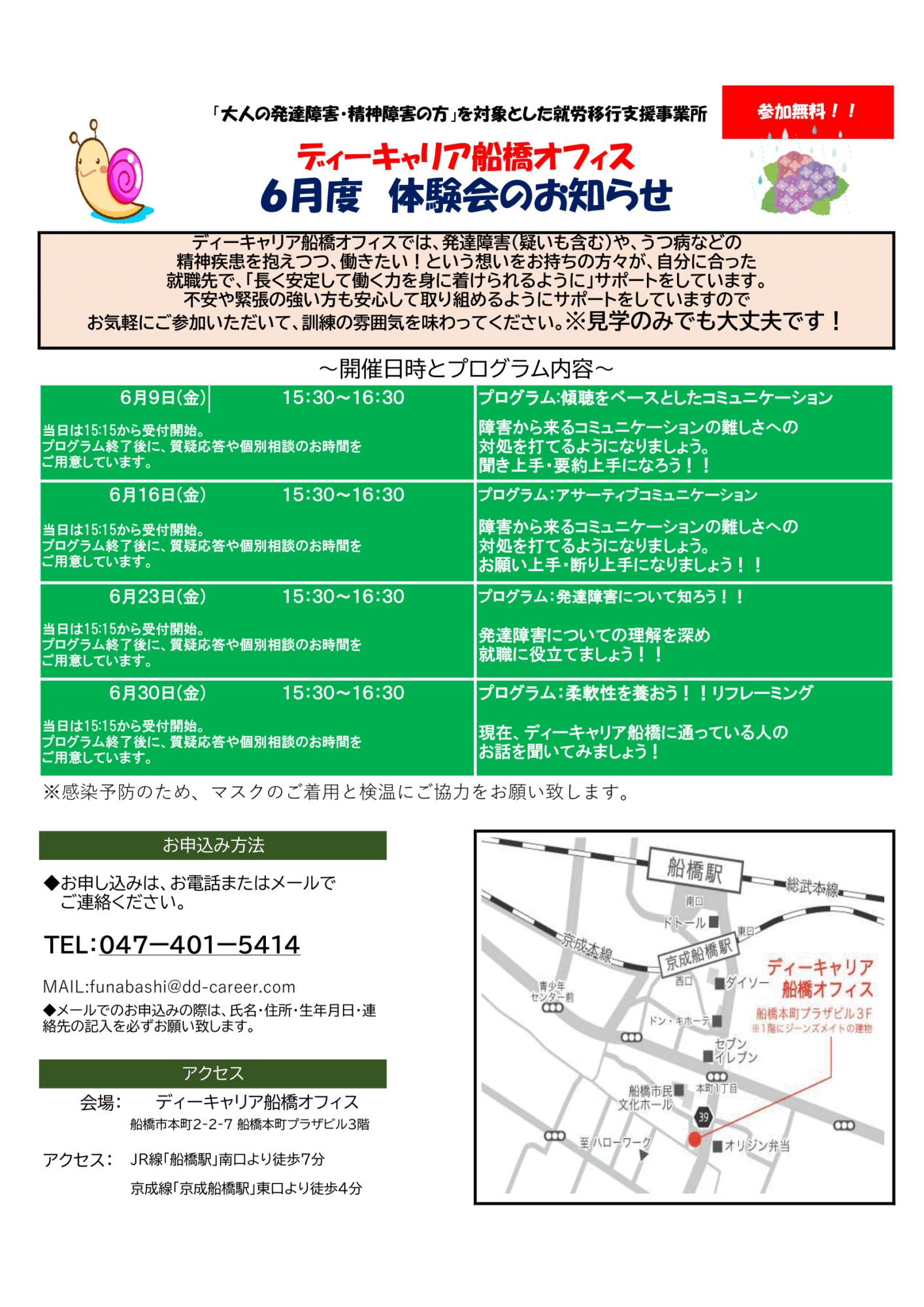 【ディーキャリア船橋オフィス】6月09日(金)・16日(金)・23日(金)・30日(金)「6月度プログラム体験会のお知らせ」