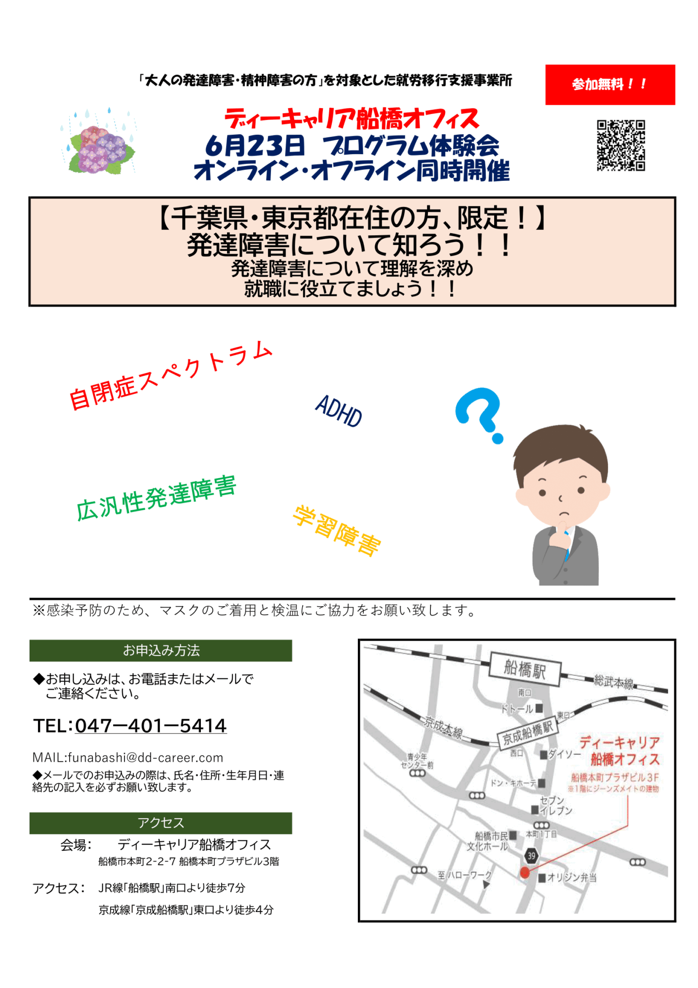 【ディーキャリア船橋オフィス】6月23日(金)「体験会 【千葉県・東京都在住の方、限定!】発達障害について知ろう!!」