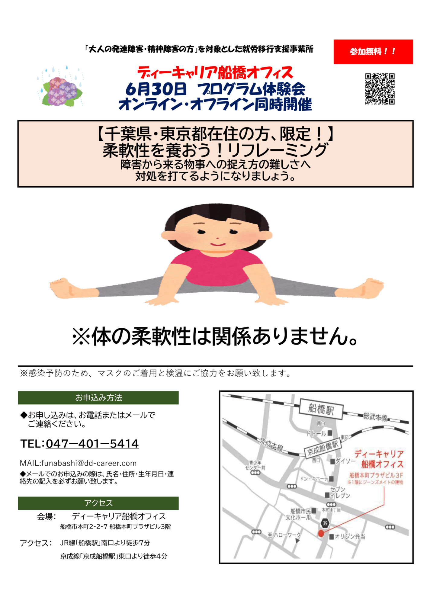 【ディーキャリア船橋オフィス】6月30日(金)「体験会 【千葉県・東京都在住の方、限定!】柔軟性を養おう!リフレーミング」