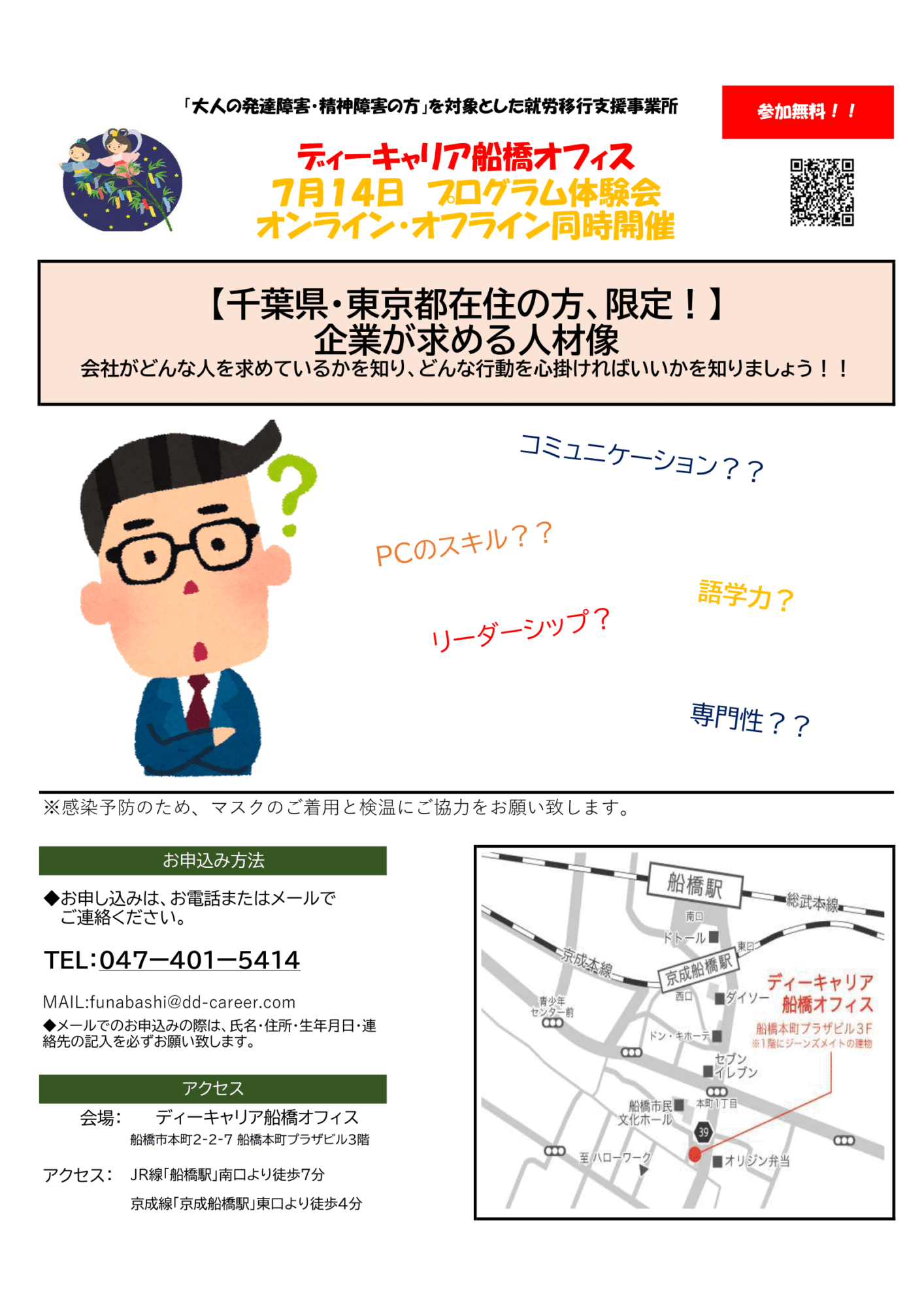 【ディーキャリア船橋オフィス】7月14日(金)「【千葉県・東京都在住の方限定】企業が求める人材像」