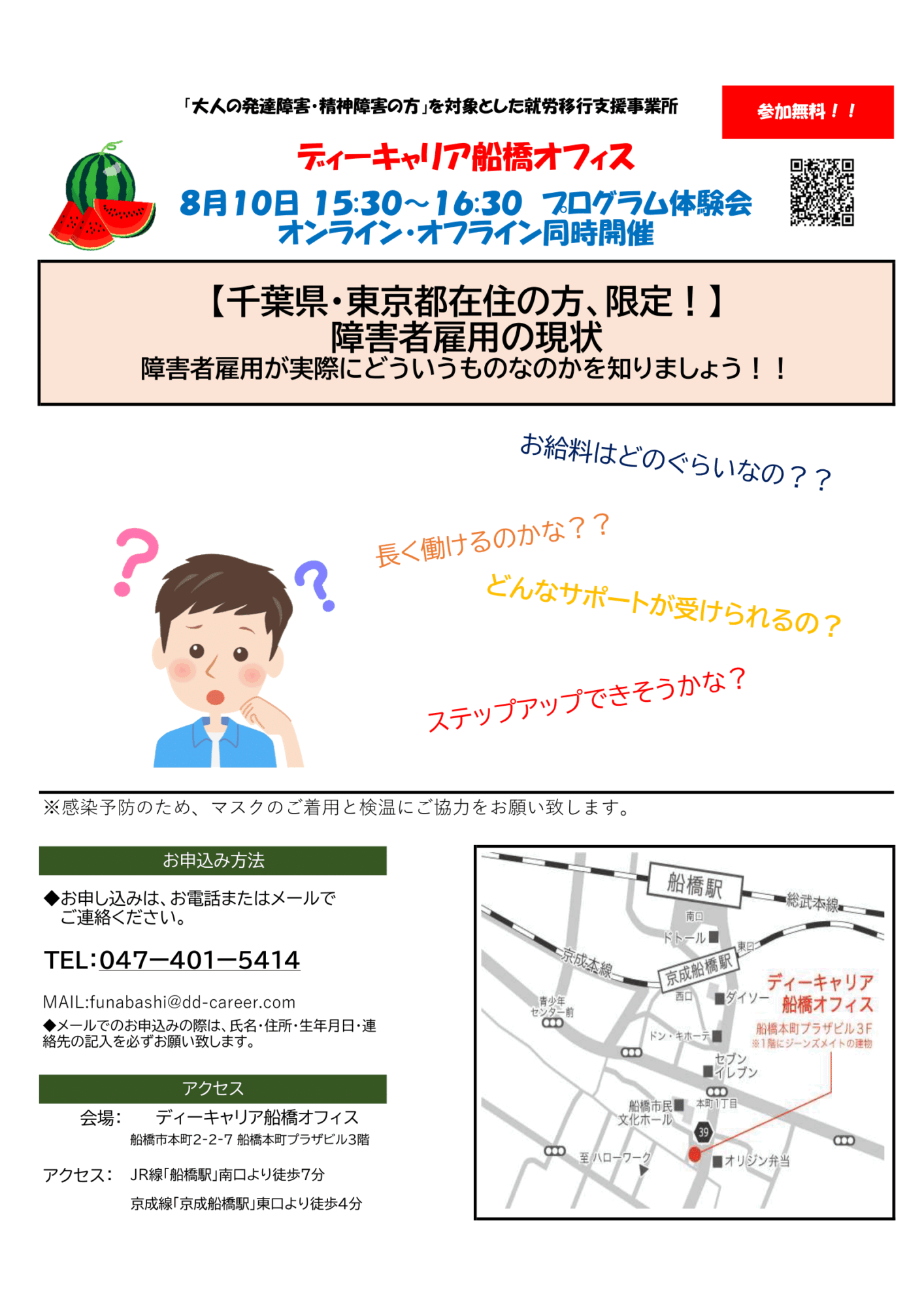 【ディーキャリア船橋オフィス】8月10日(木)「【千葉県・東京都在住の方限定】障害者雇用の現状」