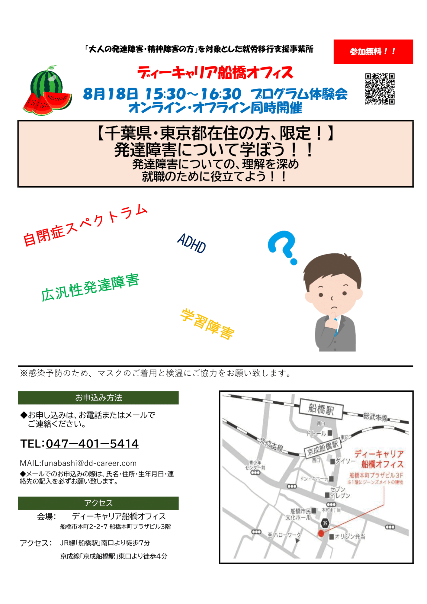 【ディーキャリア船橋オフィス】8月18日(金)「【千葉県・東京都在住の方限定】発達障害について学ぼう!!」