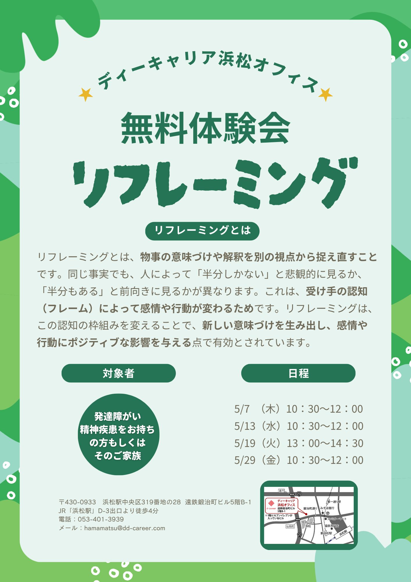 【ディーキャリア浜松オフィス】5月07日(木)・13日(水)・19日(火)・29日(金)「リフレーミング体験会」