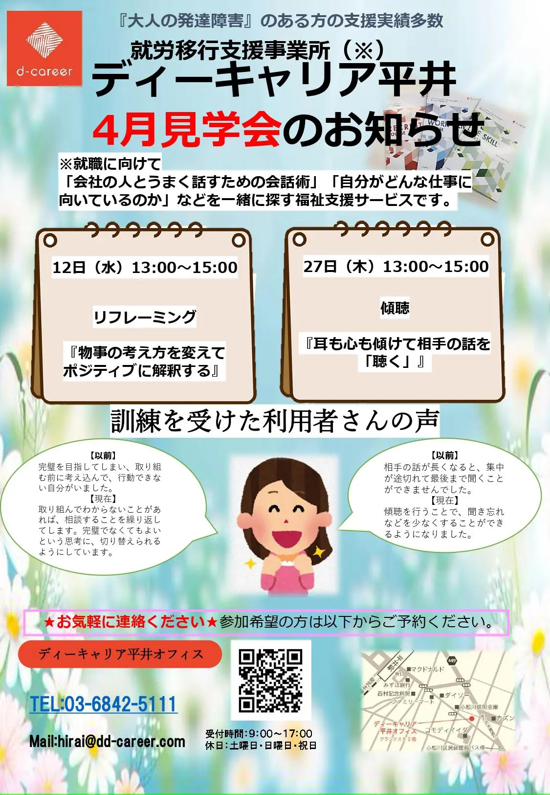 【ディーキャリア平井オフィス】4月12日(水)・27日(木)開催「4月訓練見学会のお知らせ」