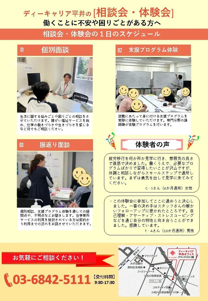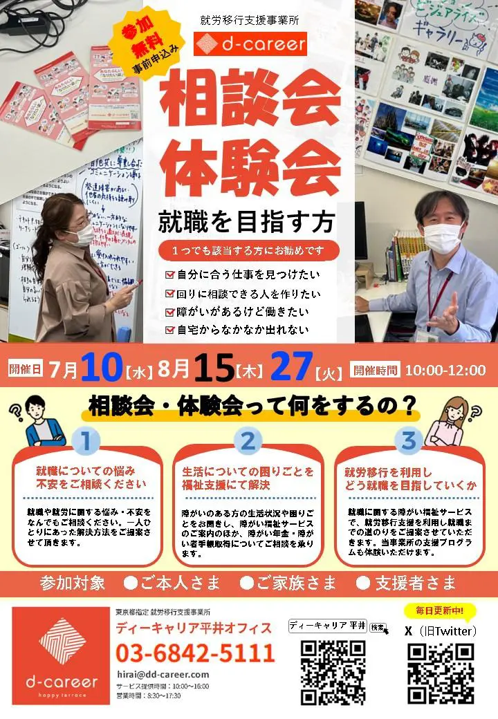 【ディーキャリア平井オフィス】7月10日(水)・8月15日(木)・8月27日(火)開催「相談会&体験会のお知らせ!」