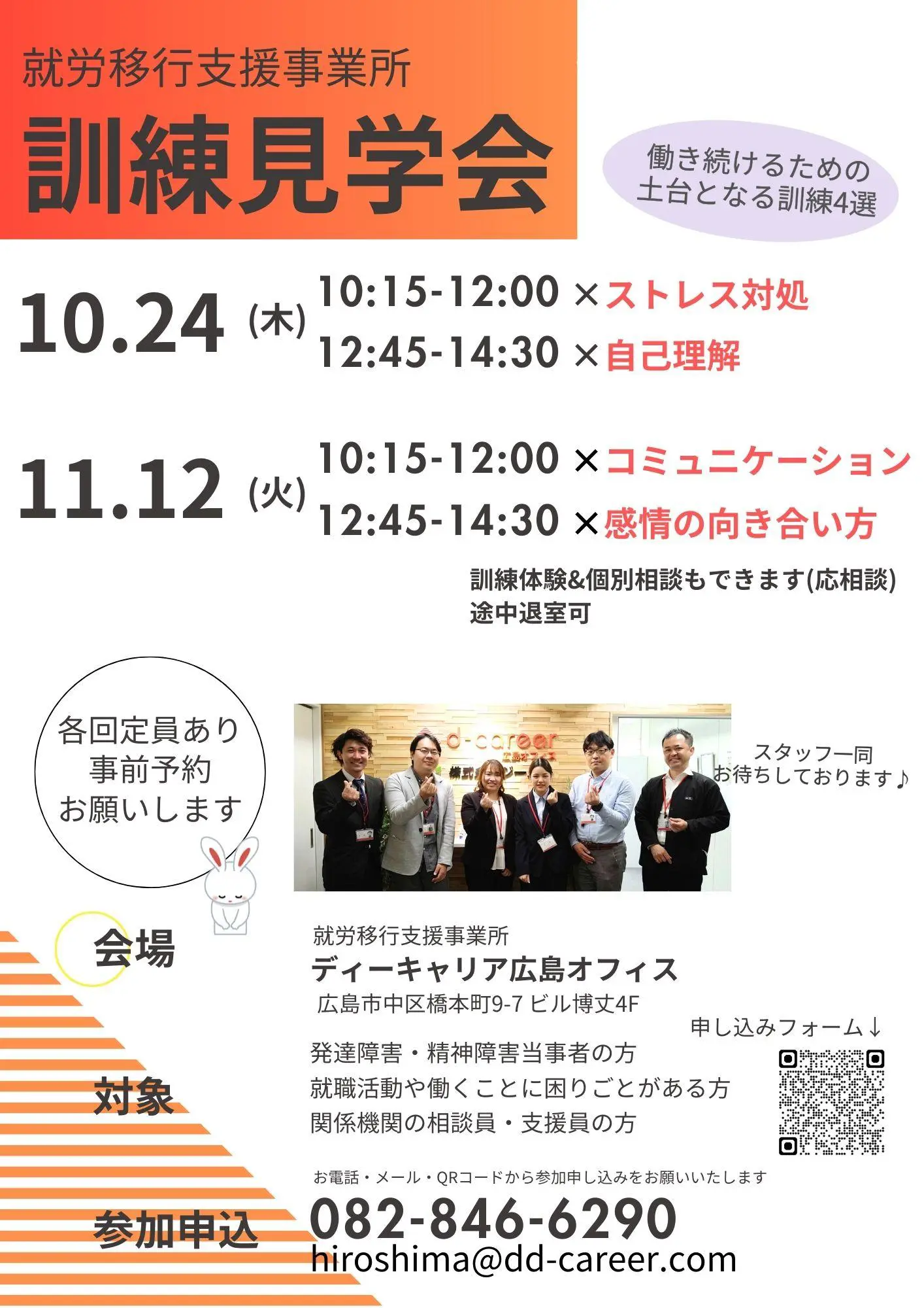 【ディーキャリア広島オフィス】10月24日(木)・11月12日(火)「就労移行支援事業所 訓練見学会」
