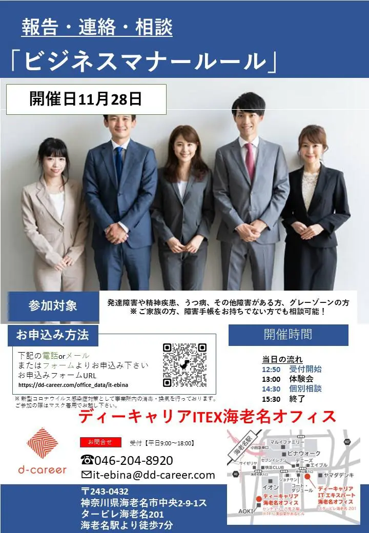 【ディーキャリアITエキスパート海老名オフィス】11月28日(月)「報告・連絡・相談『ビジネスマナー・ルール』」