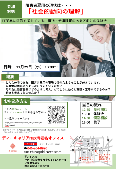 【ディーキャリアITエキスパート海老名オフィス】11月29日(水)「プログラム体験会~社会的動向の理解~」