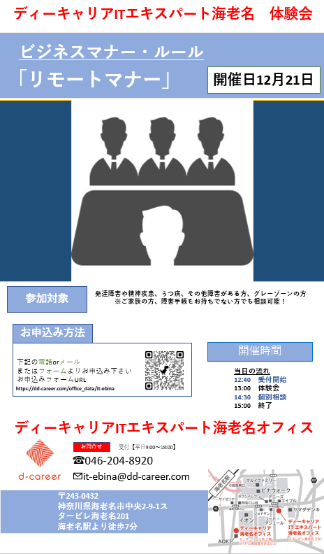 【ディーキャリアITエキスパート海老名オフィス】12月21日(木)「プログラム体験会~ビジネスマナー・ルール リモートマナー~」