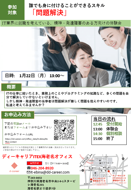 【ディーキャリアITエキスパート海老名オフィス】1月22日(月)「プログラム体験会~問題解決~」