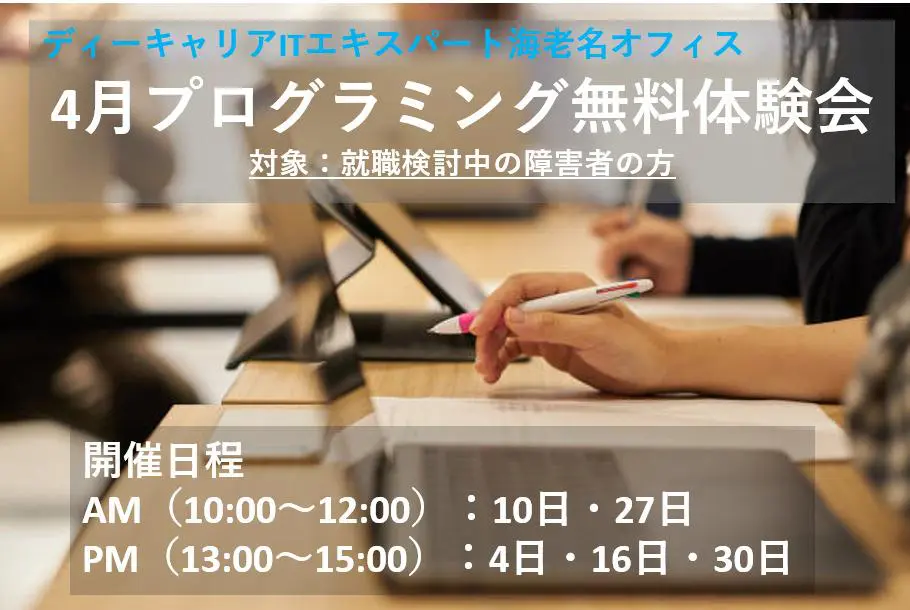 【ディーキャリアITエキスパート海老名オフィス】04月04日(木)・10日(水)・16日(火)・27日(土)・30日(火)「4月無料プログラミング体験会」