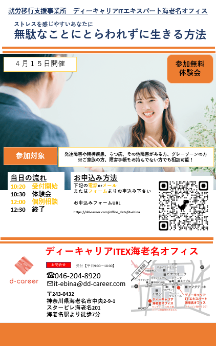 【ディーキャリアITエキスパート海老名オフィス】04月15日(月)「プログラム体験会~コントロールフォーカス~」