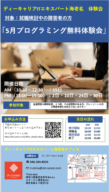 【ディーキャリアITエキスパート海老名オフィス】05月02日(木)・10日(金)・15日(水)・24日(金)・30日(木)「5月無料プログラミング体験会」