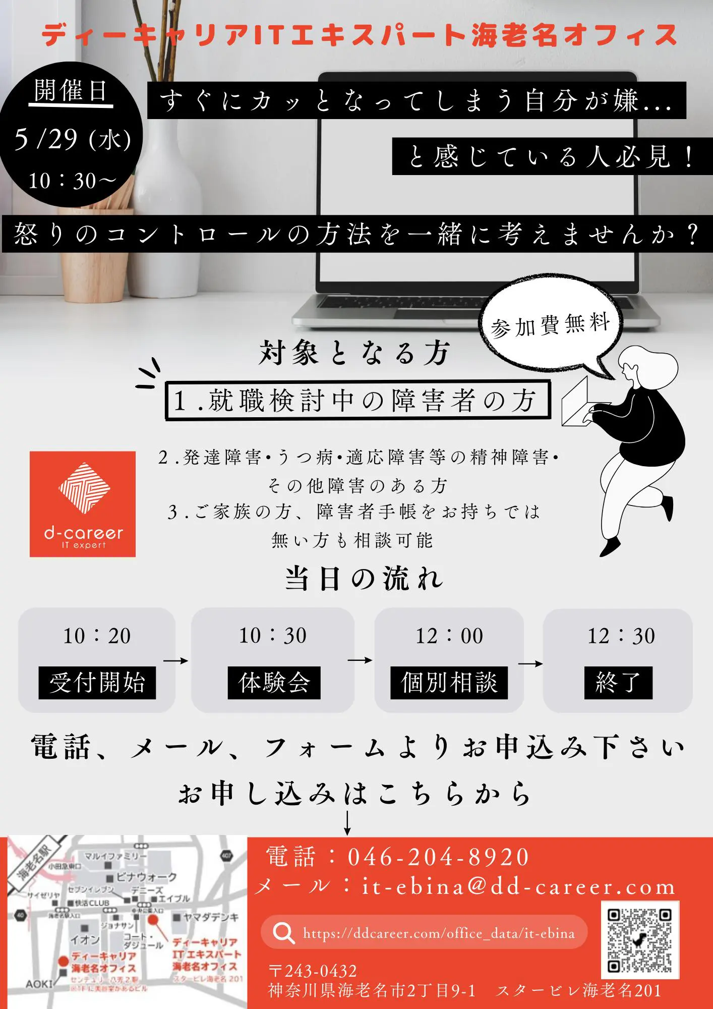 【ディーキャリアITエキスパート海老名オフィス】05月29日(水)「プログラム体験会~アンガーマネジメント~」