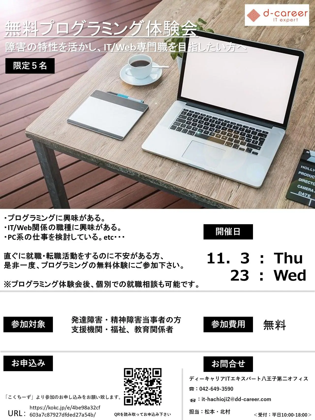 【ディーキャリアITエキスパート八王子オフィス】11月3日(木)・23日(水)「無料プログラミング体験会」