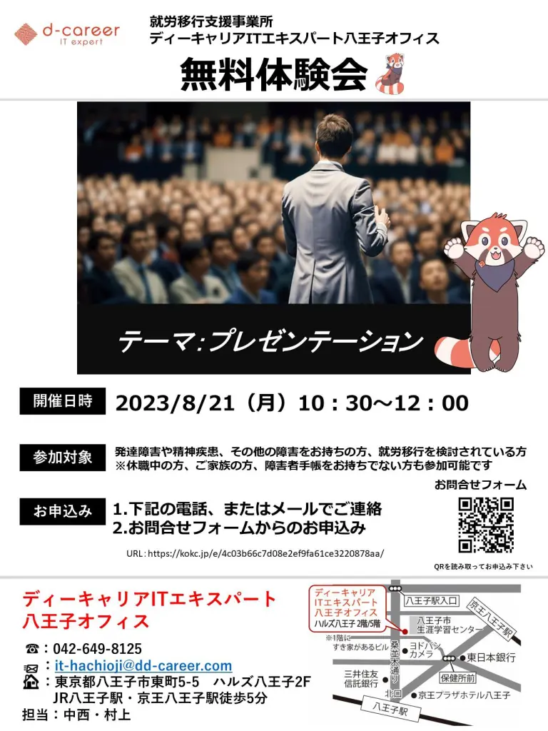 【ディーキャリアITエキスパート八王子オフィス・ITエキスパート八王子第二オフィス】08月21日(月)「無料体験会」