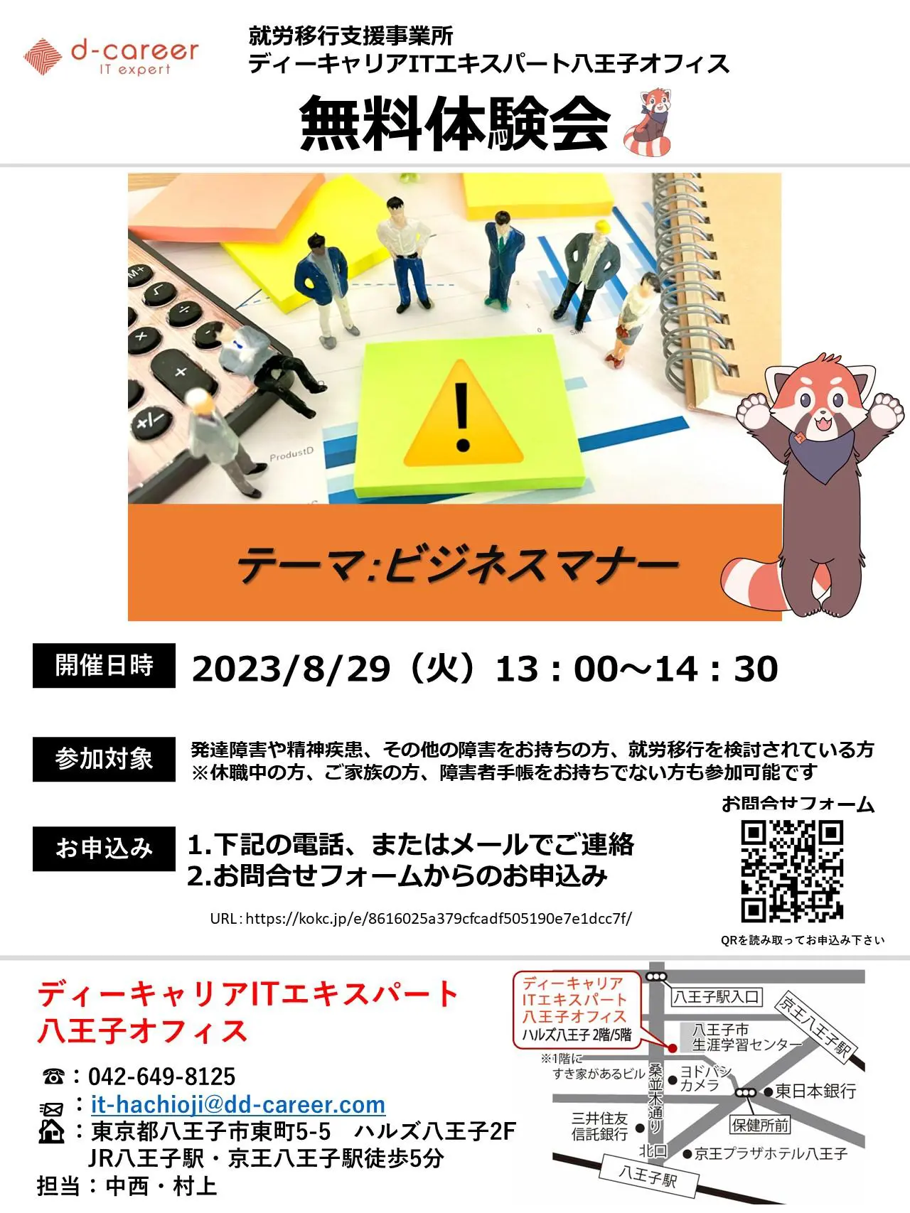 【ディーキャリアITエキスパート八王子オフィス・ITエキスパート八王子第二オフィス】08月29日(火)「無料体験会」