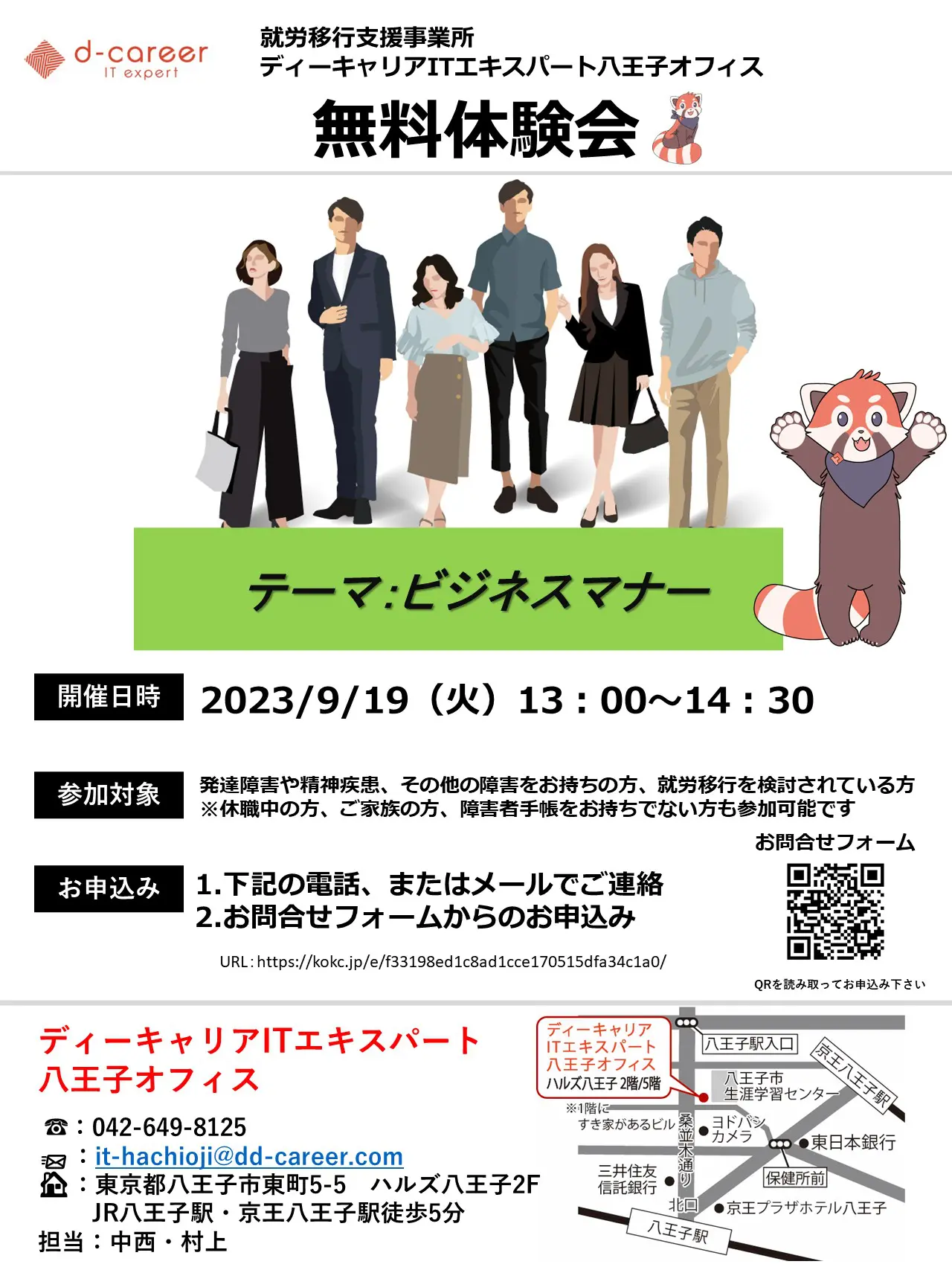 【ディーキャリアITエキスパート八王子オフィス・ITエキスパート八王子第二オフィス】09月19日(火)「無料体験会」