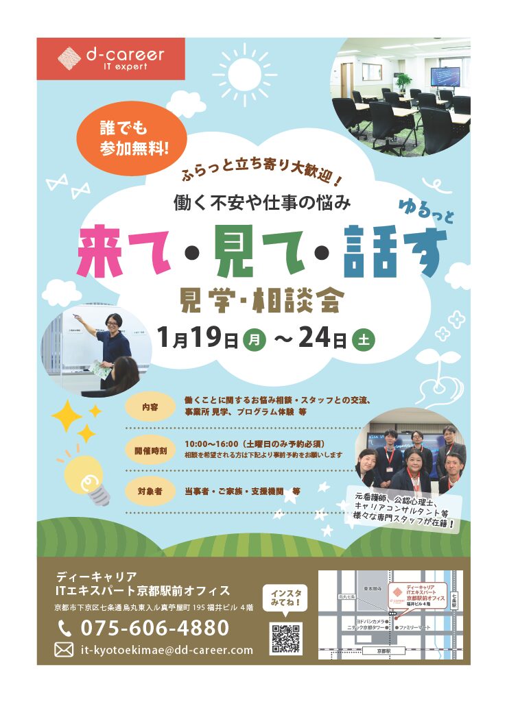 【ディーキャリアITエキスパート京都駅前オフィス】01月19日(月)・20日(火)・21日(水)・22日(木)・23日(金)・24日(金)開催「来て・見て・話す~見学相談会~」