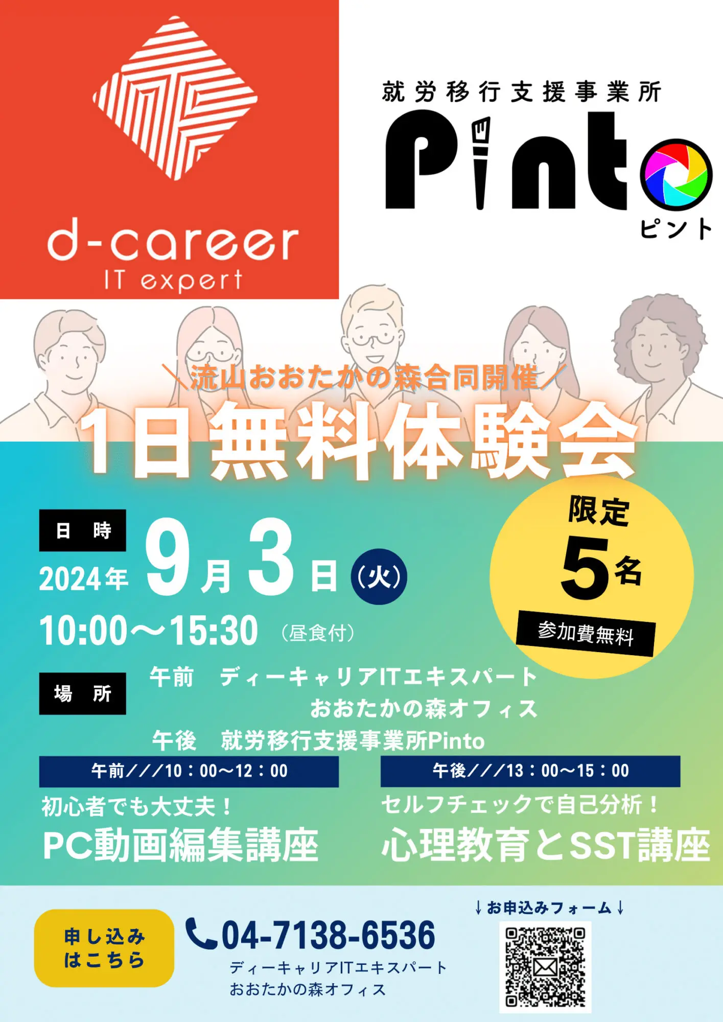 【ディーキャリアITエキスパートおおたかの森オフィス】9月03日(火)「流山おおたかの森合同開催1日無料体験会」