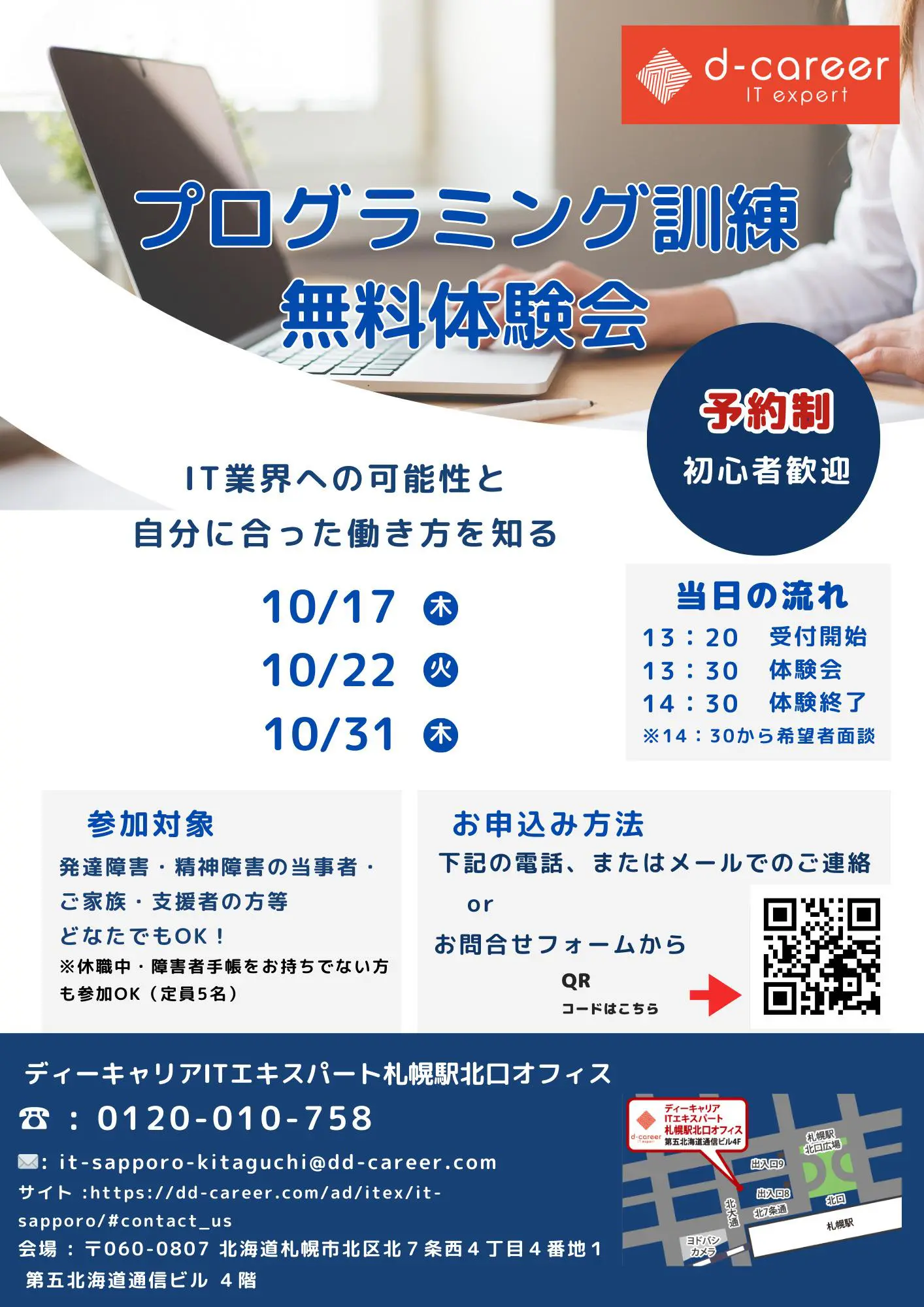 【ディーキャリアITエキスパート札幌駅北口オフィス】10月17日(木)・22日(火)・31日(木)「プログラミング訓練 無料体験会」