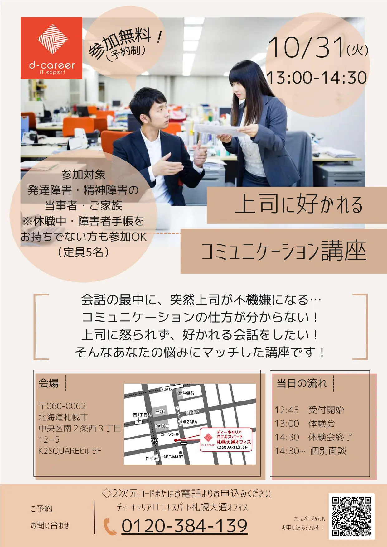 【ディーキャリアITエキスパート札幌大通オフィス 】10月31日(火)「上司に好かれるコミュニケーション講座」