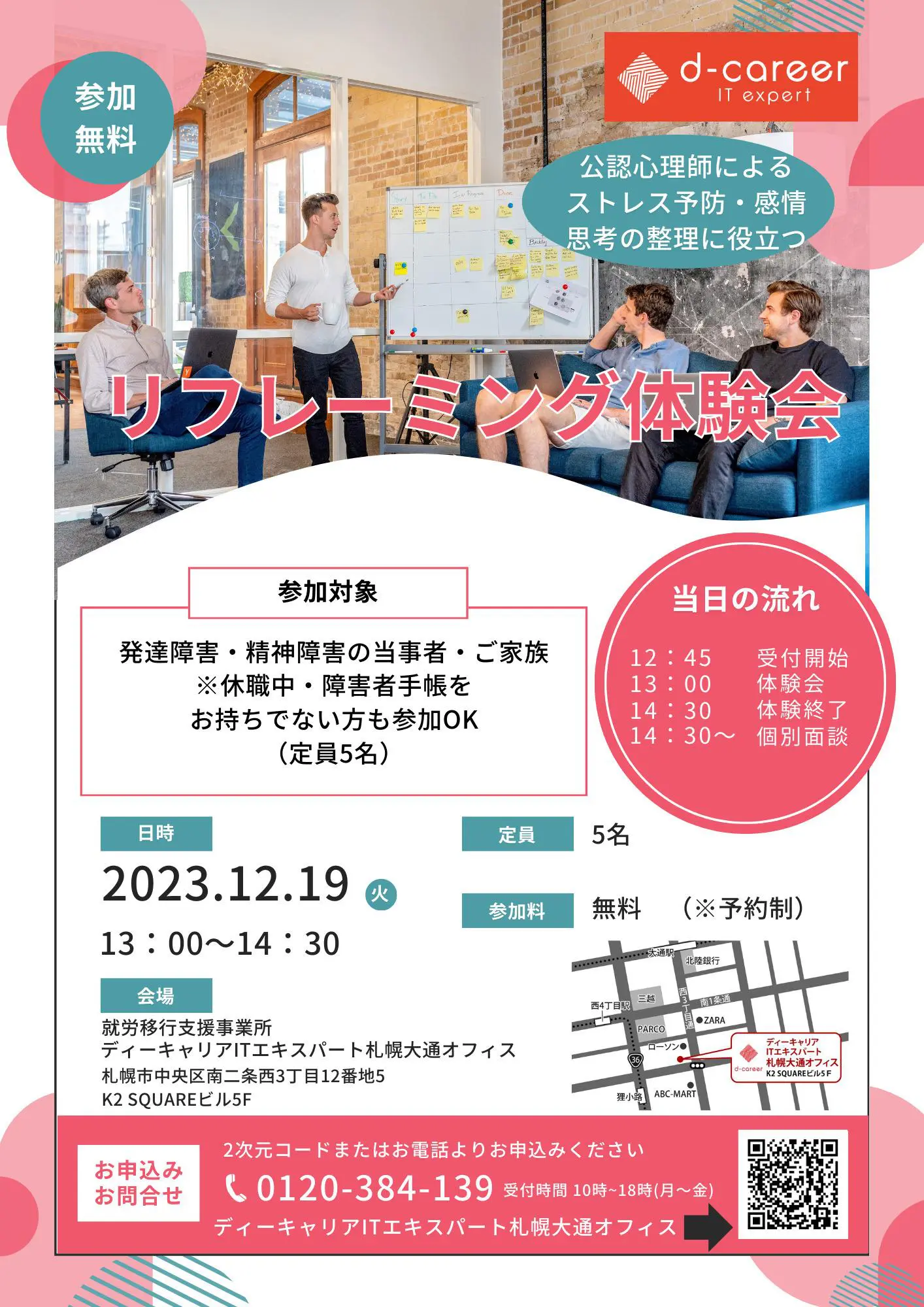 【ディーキャリアITエキスパート札幌大通オフィス 】12月19日(火)「リフレーミング体験会」