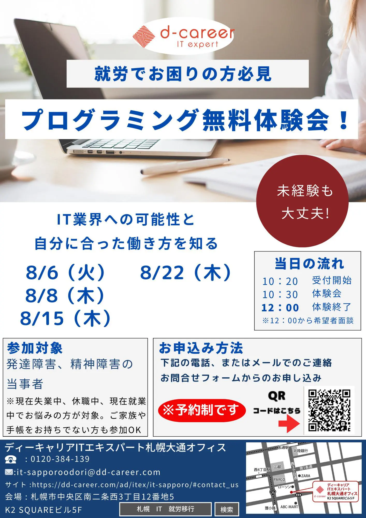 【ディーキャリアITエキスパート札幌大通オフィス 】08月06日(火)・08月08日(木)・08月15日(木)・08月22日(木)「8月プログラミング体験会」