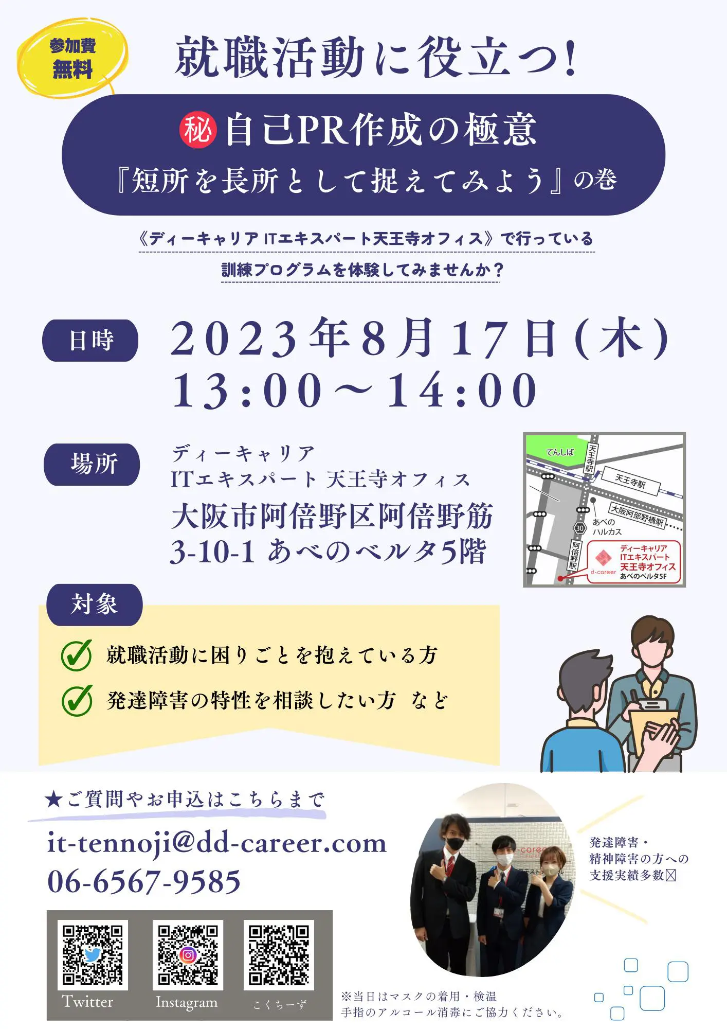 【ディーキャリアITエキスパート天王寺オフィス】8月17日(木)「就職活動に役立つ!自己PR作成の極意『短所を長所として捉えてみよう』」