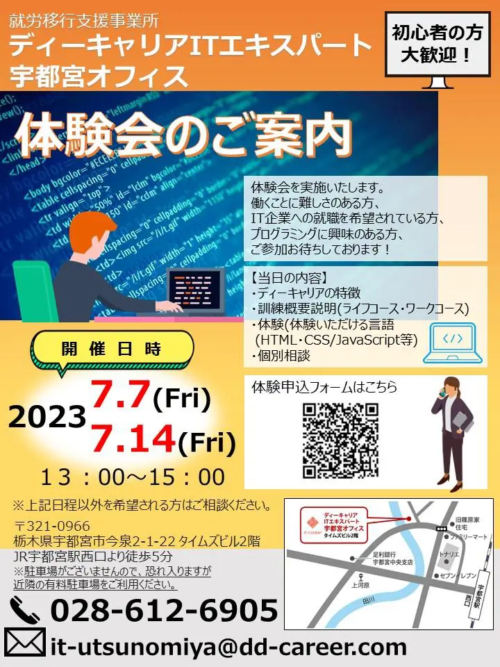 【ディーキャリアITエキスパート宇都宮オフィス】7月07日(金)・14日(金)「プログラム体験会」