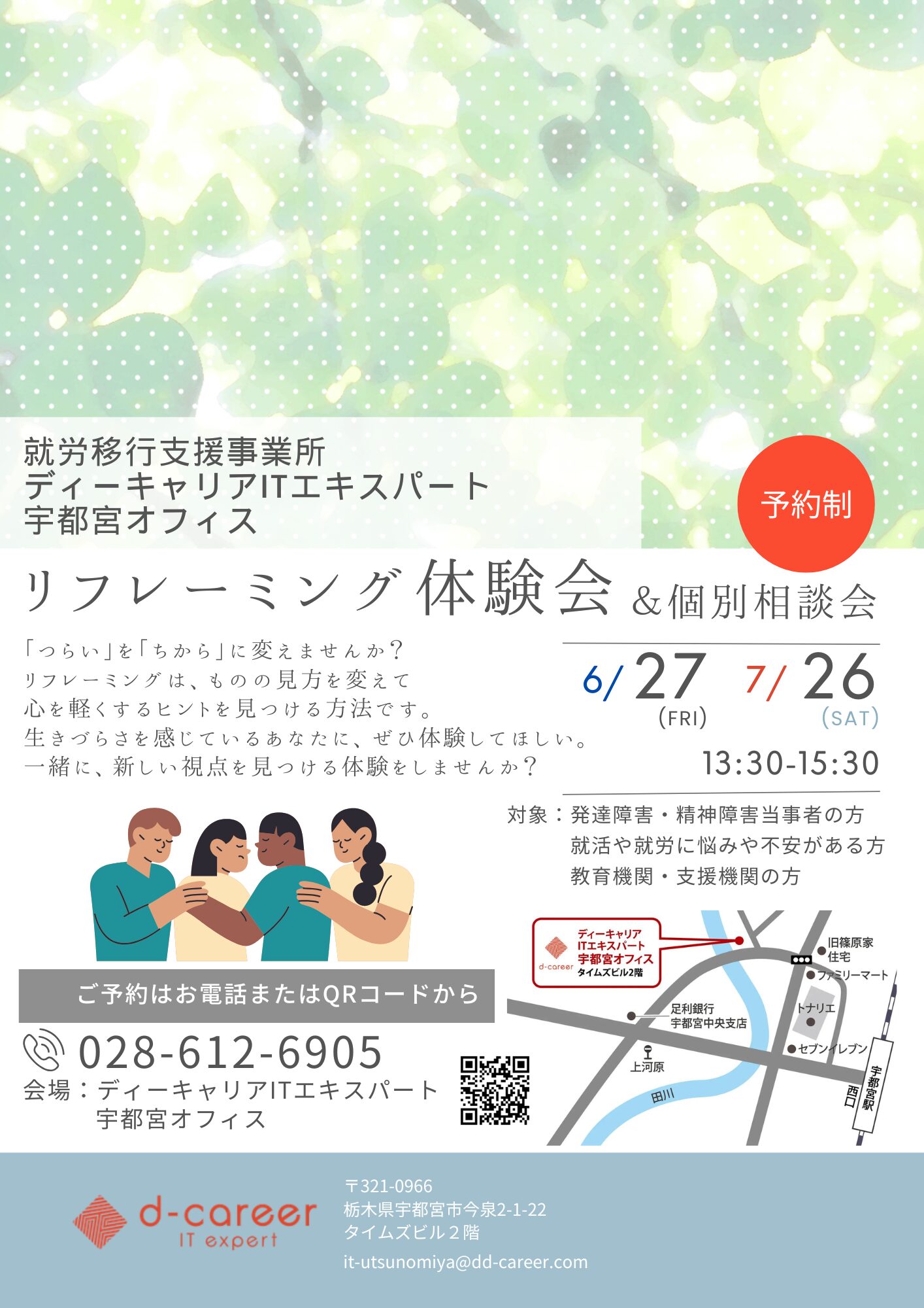 【ディーキャリアITエキスパート宇都宮オフィス】6月27日(金)・7月26日(土)「リフレーミング体験会&個別相談会」