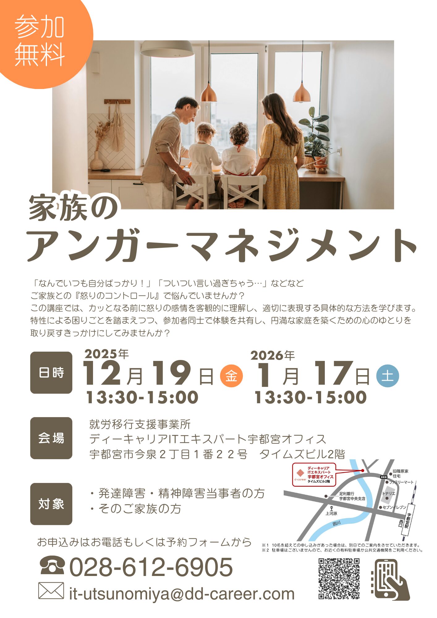 【ディーキャリアITエキスパート宇都宮オフィス】12月19日(金)・01月17日(土)「家族のアンガーマネジメント」