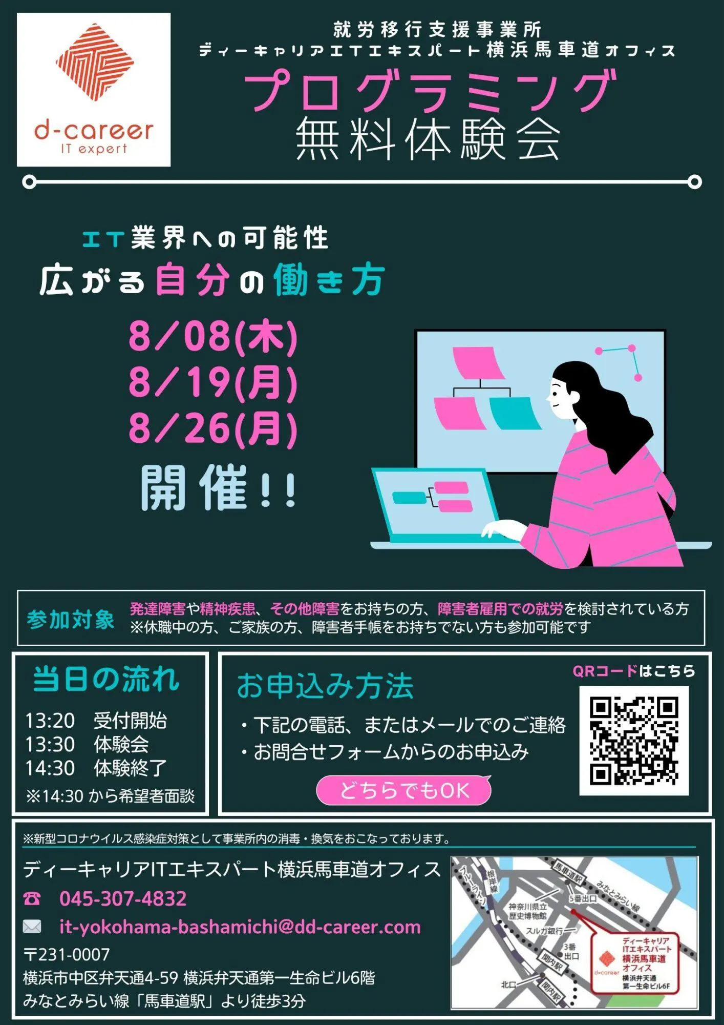 【ディーキャリアITエキスパート横浜馬車道オフィス】8月08日(木)・19日(月)・26日(月)「大人の発達障害の特性による困りごとがある方へ! IT業界・パソコン業界への就職のための無料プログラミング体験会&無料相談会」