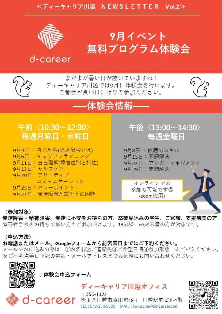 【ディーキャリア川越オフィス】9月11日(月)・13日(水)・15日(金)・20日(水)「無料体験会のお知らせ」