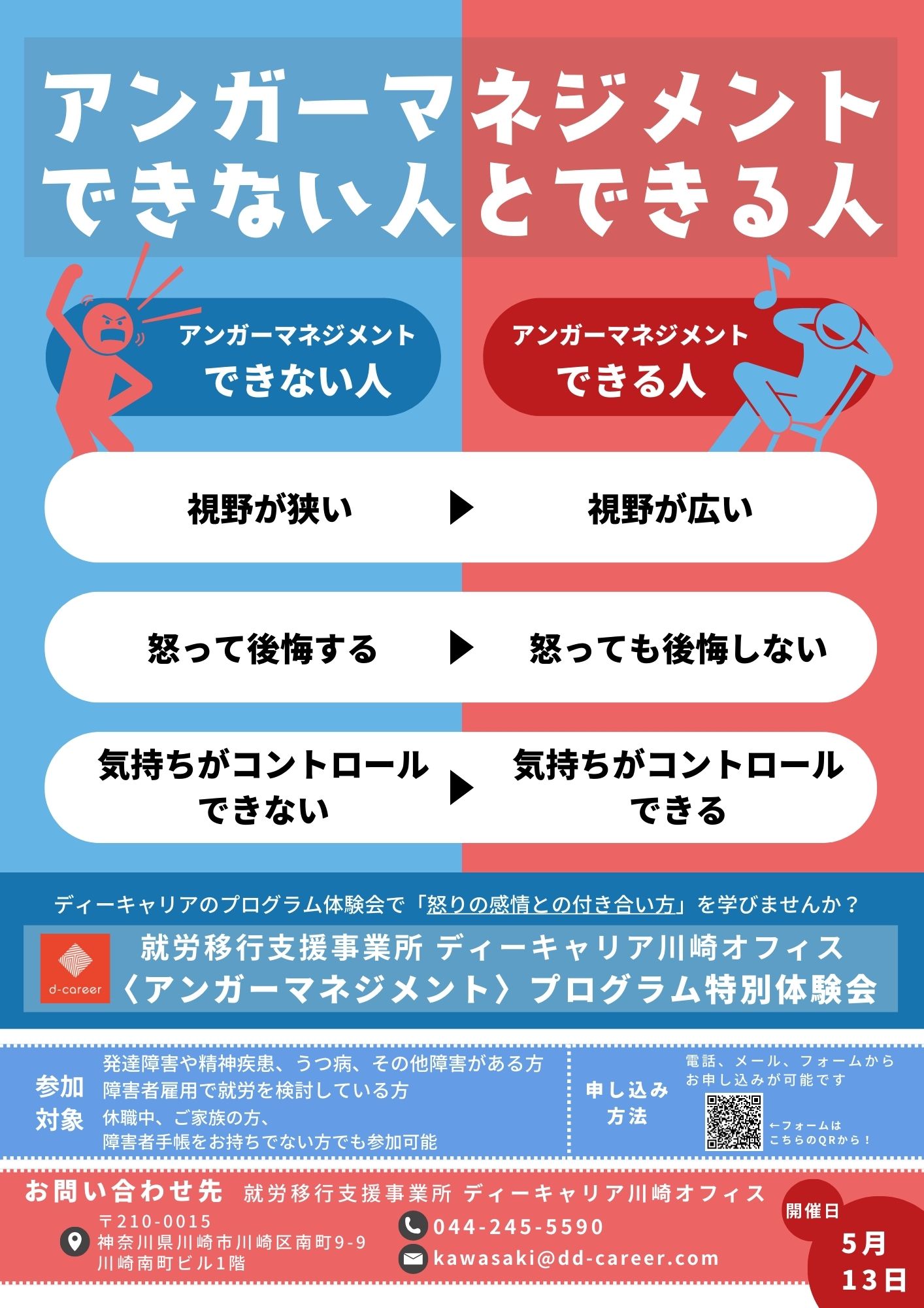 【ディーキャリア川崎オフィス】5月12日(水)「リモート訓練体験会「アンガーマネジメント」」