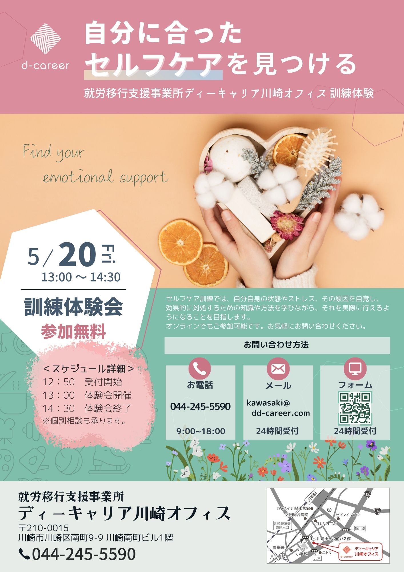【ディーキャリア川崎オフィス】5月20日(火)「<地域限定:川崎市、横浜市、大田区にお住まいの方対象> 自分に合ったセルフケアを見つける 就労移行支援事業所ディーキャリア川崎オフィス訓練体験」