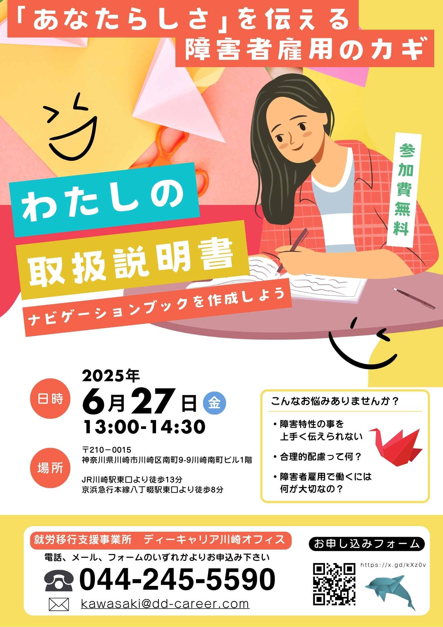 【ディーキャリア川崎オフィス】6月27日(金)「<地域限定:川崎市、横浜市、大田区にお住まいの方対象> わたしの取扱説明書! ナビゲーションブックを作成しよう」