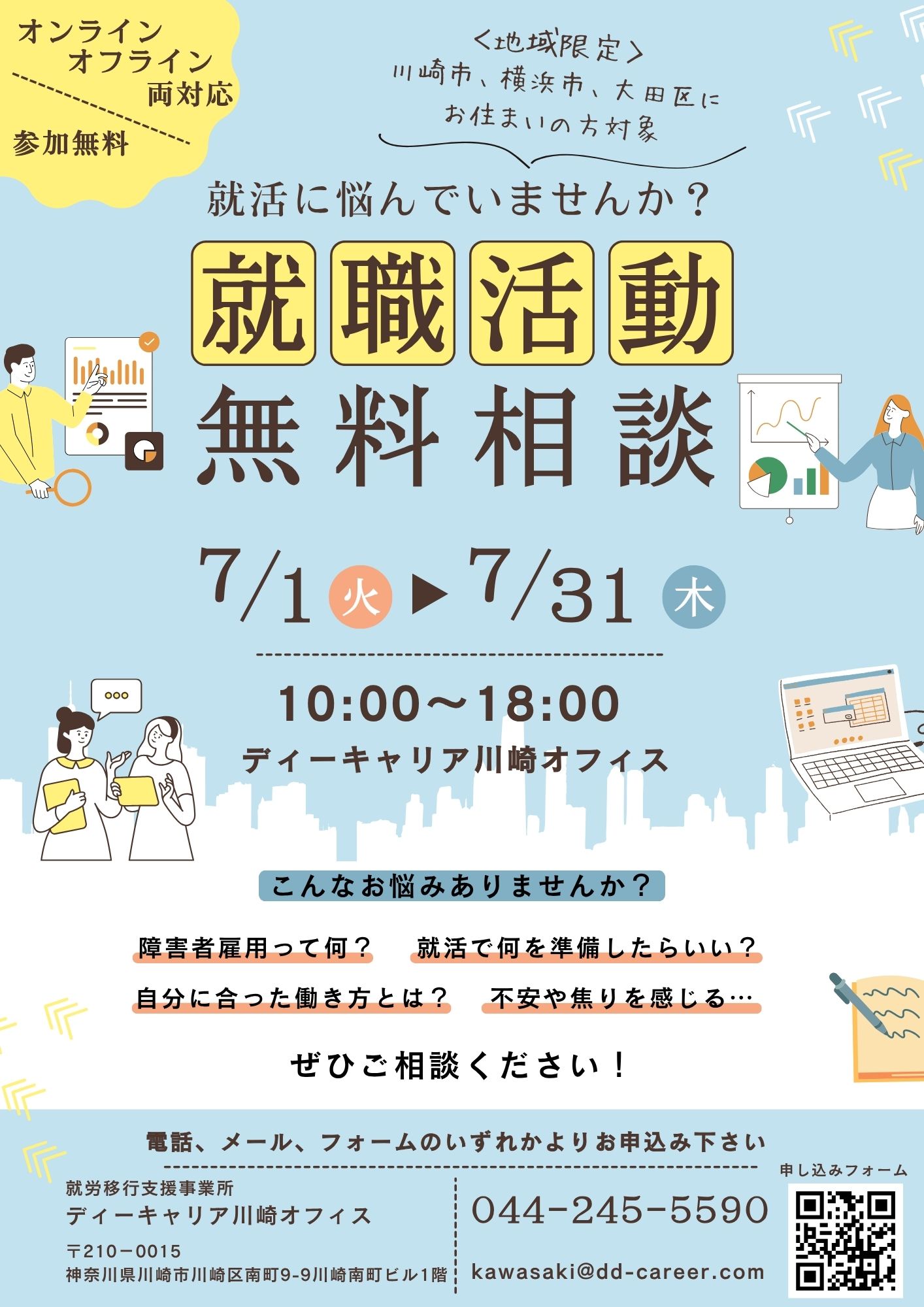 【ディーキャリア川崎オフィス】7月平日開催<地域限定:川崎市、横浜市、大田区にお住まいの方対象> 「就職活動に悩んでませんか? 特性による困りごとのある方向け!『就活無料相談!』」