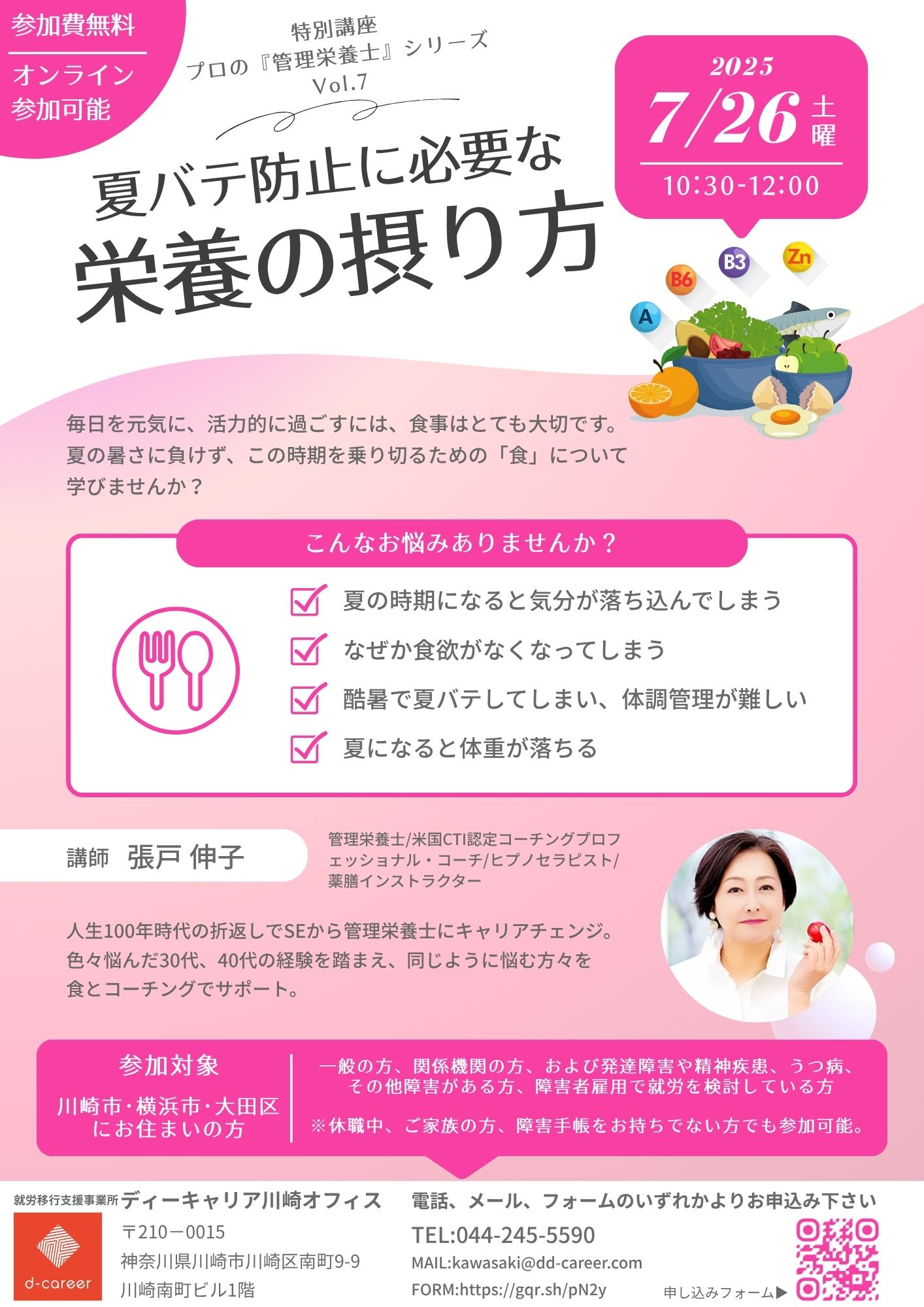 【ディーキャリア川崎オフィス】7月26日(土)「特別講座 プロの管理栄養士 シリーズ Vol.7 『夏バテ防止に必要な栄養の摂り方』」