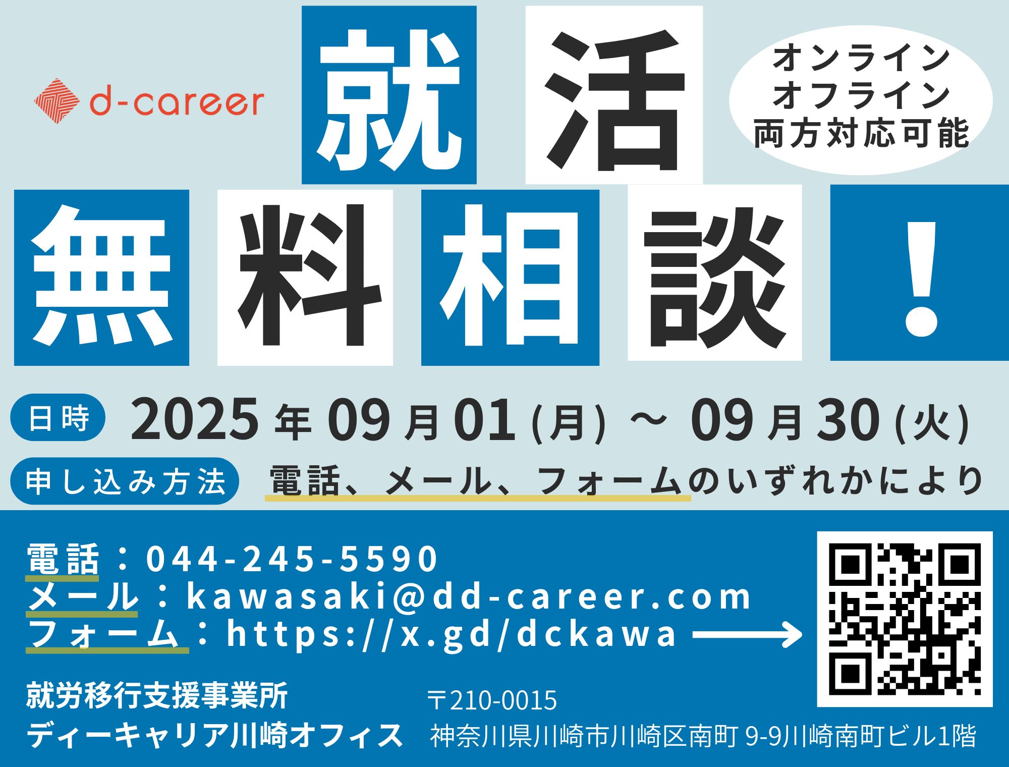 【ディーキャリア川崎オフィス】9月1日(水)~9月30日(木)「発達障害の特性による困りごとのある方向け「精神保健福祉士による無料相談」」