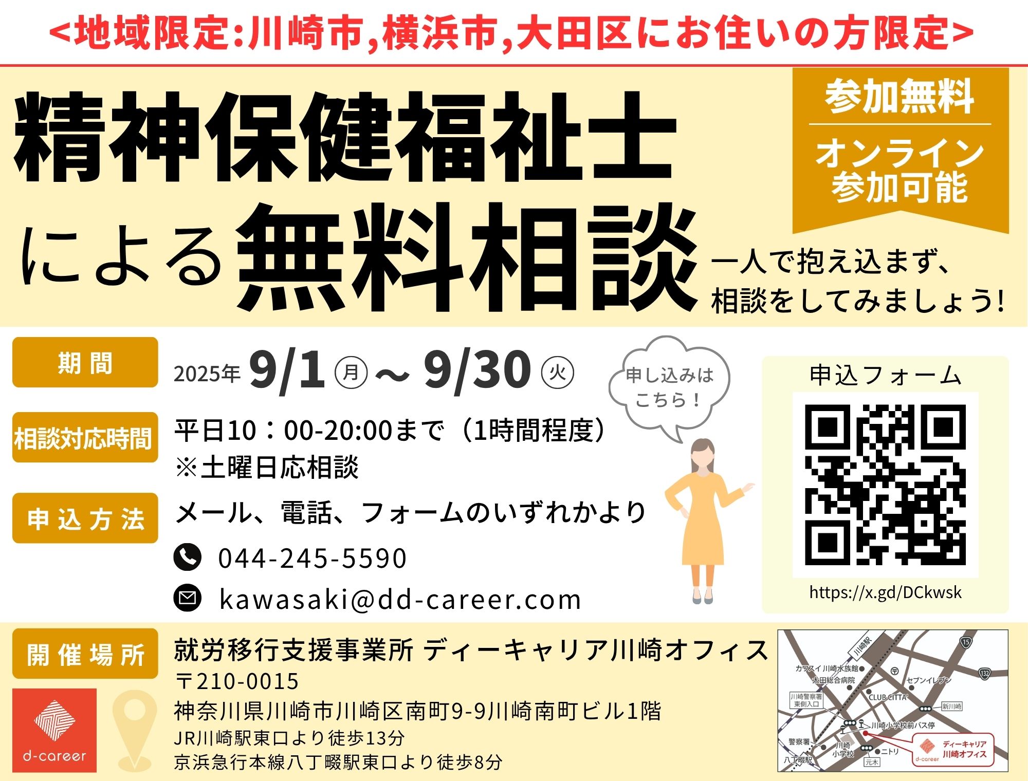 【ディーキャリア川崎オフィス】9月平日開催「<地域限定:川崎市、横浜市、大田区にお住いの方限定> 【精神保健福祉士】による【無料相談】精神障害、発達障害の特性による困りごと、お悩みのある方向け!」